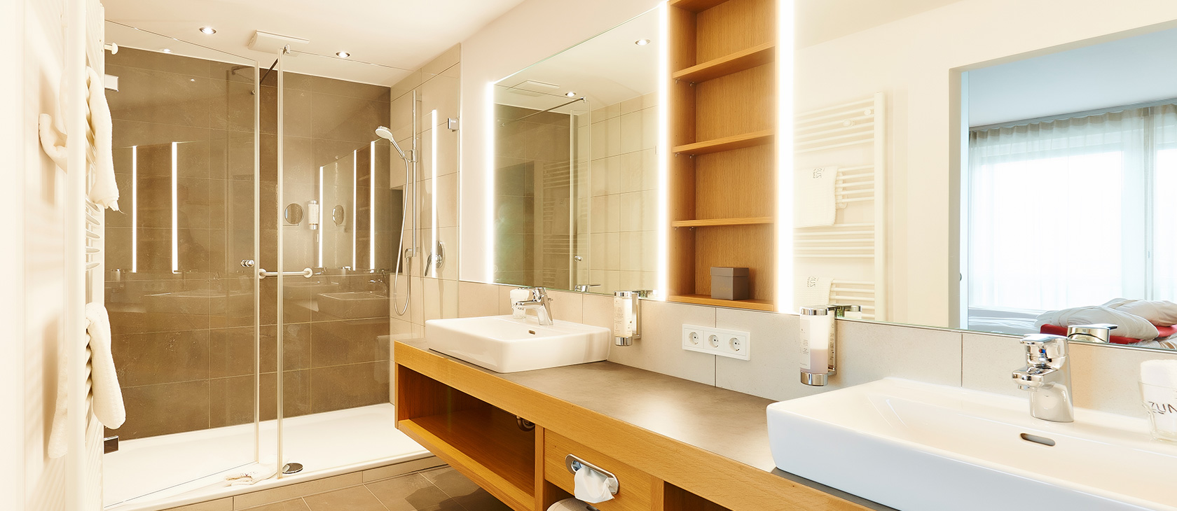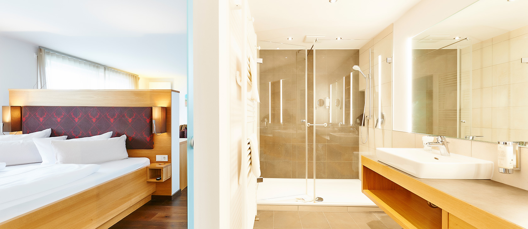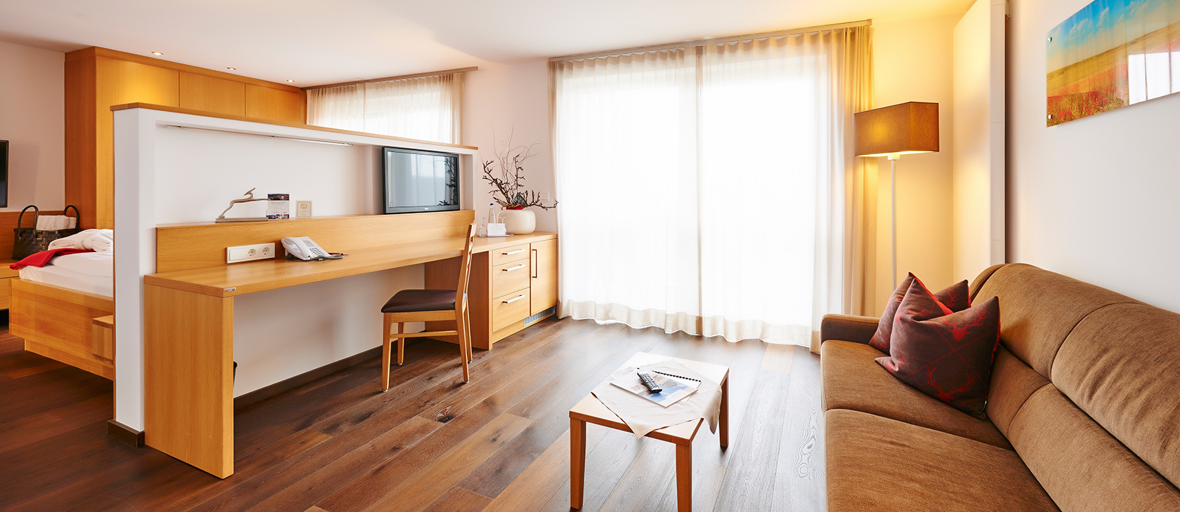 Our Studio Gala is equipped with: Separate living and sleeping area (separated via room divider), entrance area with coat rack, shower, separate WC, hairdryer, double washbasins, cosmetics mirror, satellite TV, telephone, wifi, minibar, room safe, rented bathrobe, west-facing balcony.